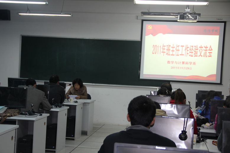 为强化班级管理,提高班主任工作的管理艺术,根据学生处统一要求,我系于2011年11月29日晚7:30在2号教学楼数学建模实验室举办了2011年班主任工作经验交流会,系主任李超老师、党总支副书记丁争尚老师、副主任赵健老师出席了交流会并担任评委。本次班主任经验交流会共有13位班主任老师分别就自己的工作做了交流发言,经评委评选,我系岳毅蒙老师荣获一等奖;程国老师、罗俊丽老师荣获二等奖;李粉红老师、孔亮老师荣获三等奖。会议结束时,系领导分别为获奖班主任颁发了荣誉证书。系党总支副书记丁争尚老师做了总结讲话,勉励大家相互学习,取长补短,共同做好我系的班主任工作。会后,系领导和班主任、辅导员、学生干部一起就冬季安全检查了我系全部学生宿舍。