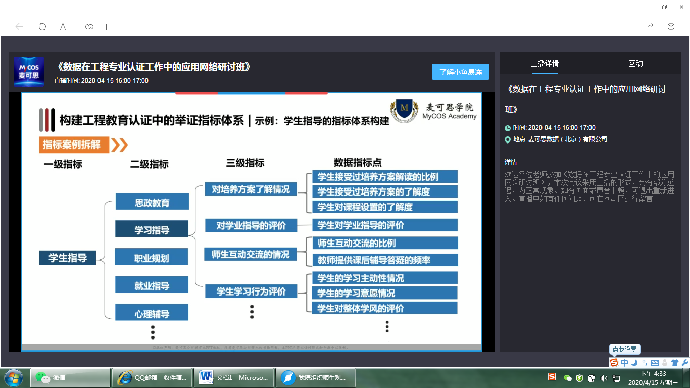 为了助力新工科专业认证共识、提升专业认证能力,2020年4月15日数计学院计算机专业教师统一在线上参加了由麦可思资深专家开设的《数据在工程专业认证工作中的应用网络研讨班》,本次培训旨在学习数据举证在工程专业认证工作中的应用。