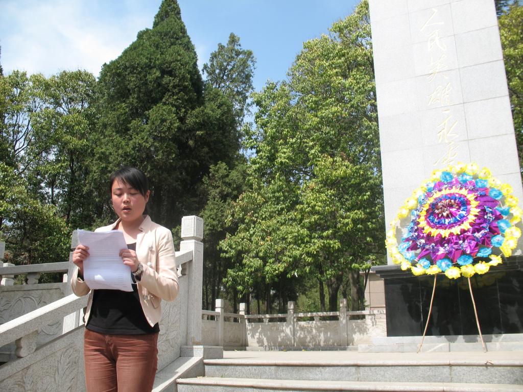 由学生党员代表我系师生为革命先烈敬献花圈。全体师生为烈士默哀3分钟,教师党员代表李艳发言。