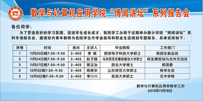 本次“博闻讲坛”系列报告会作为数计学院“一院一品”的品牌活动之一,受到了校内各位老师的大力支持和同学们的一致好评,同学们在听取了各位专家的报告之后反响强烈,受益匪浅,取得了很好的效果。