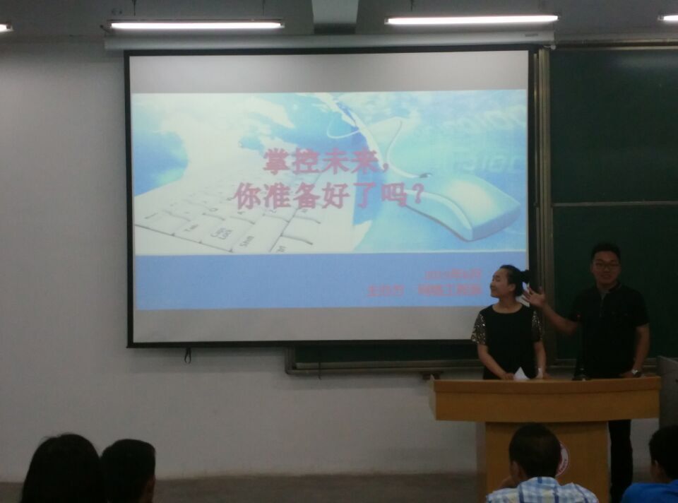 2015年6月1日晚七点半,由我院网络工程系主办的“掌控未来,你准备好了吗”主题报告会在一号楼多媒体2准时召开。参加此次活动的嘉宾有经济管理学院信息管理与信息系统专业大三学生陈立,我院计算机科学与技术专业大三学生李吴奇和李一帆以及网络工程专业2013级、2014级全体学生。