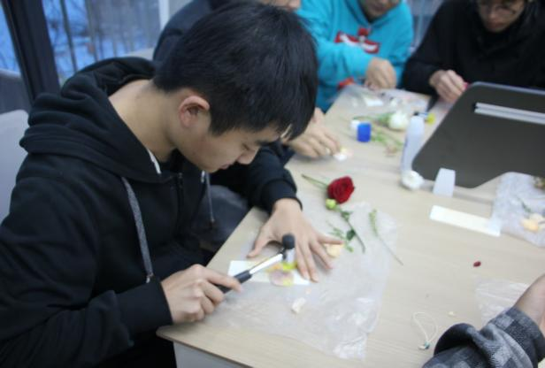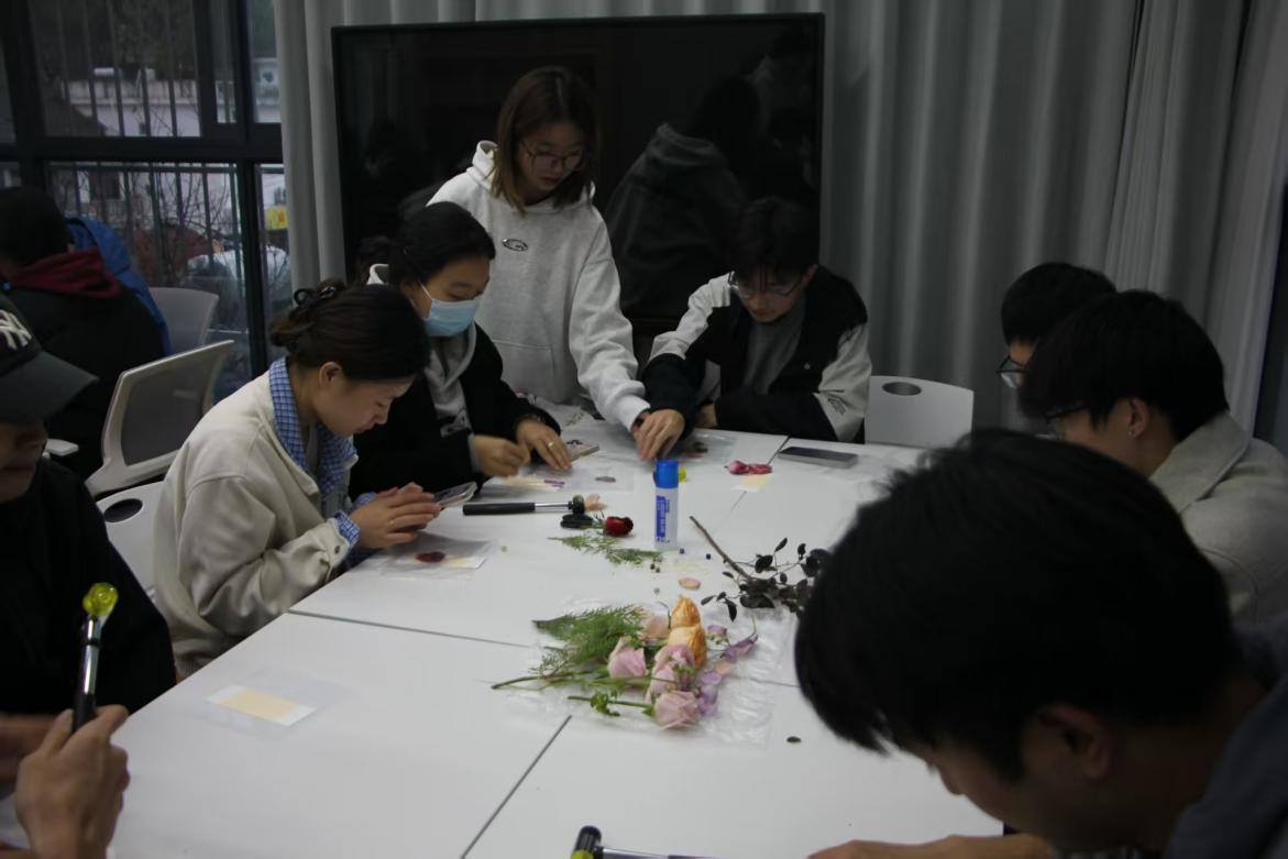 筹备阶段,生活部提前采购空白书签、橡胶锤等拓印工具,精选校园周边纹理清晰、色彩鲜亮的柏叶、月季花瓣等素材并分类保鲜;通过“到梦空间”组织报名并布置场地,营造整洁有序的创作氛围。活动伊始,工作人员详解“选材—固定—敲击—揭纸”流程及技巧、注意事项,助力学子快速上手,保障活动顺畅推进。