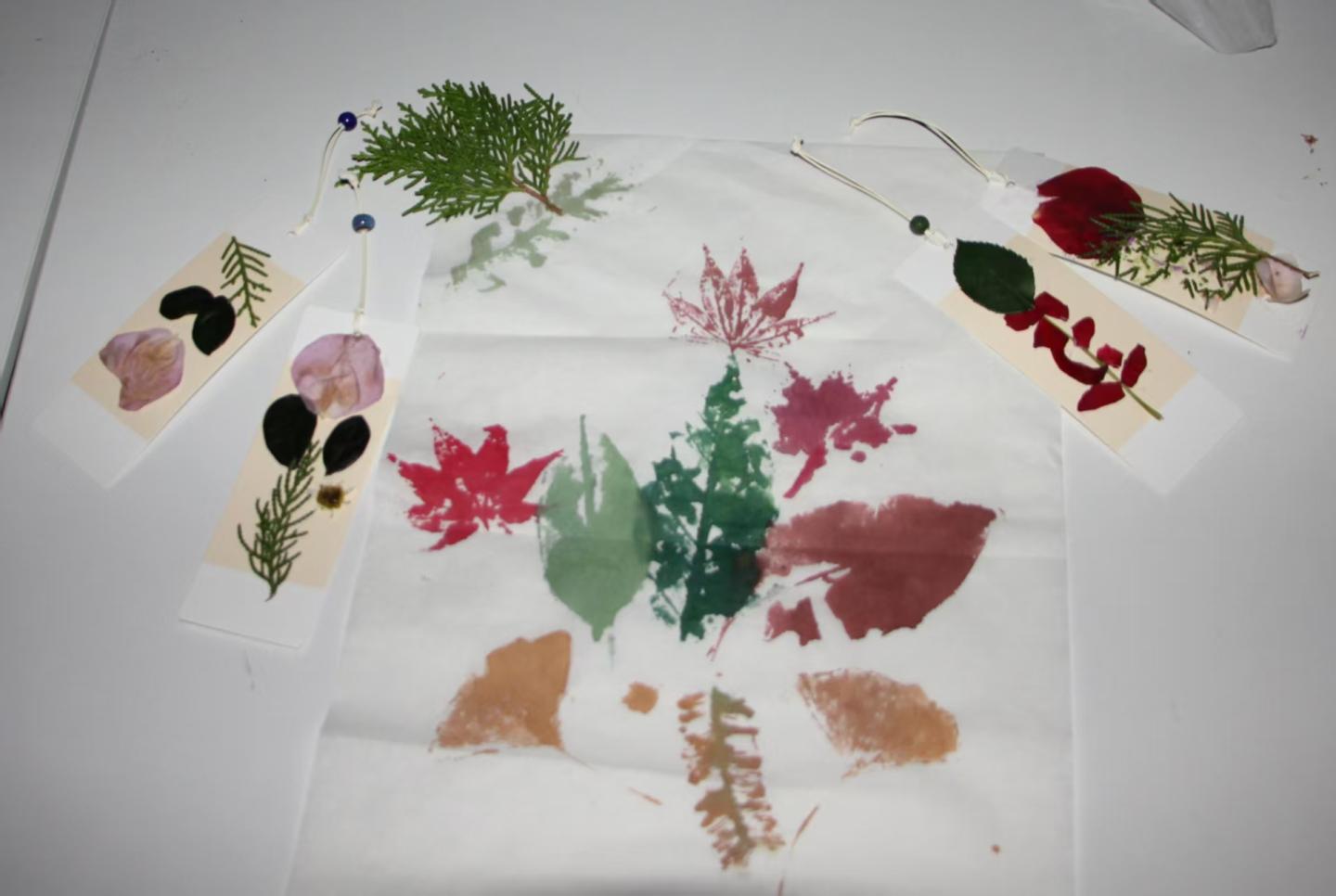 创作环节,学子们创意迸发:用柏叶勾勒纹路,以绿叶片搭配粉花瓣组合图案。遇到问题时,工作人员及时答疑,清脆敲击声中满是专注。30张拓印书签最终整齐排列,宛如一副鲜活的“校园植物艺术地图”,尽显自然肌理与创意巧思。