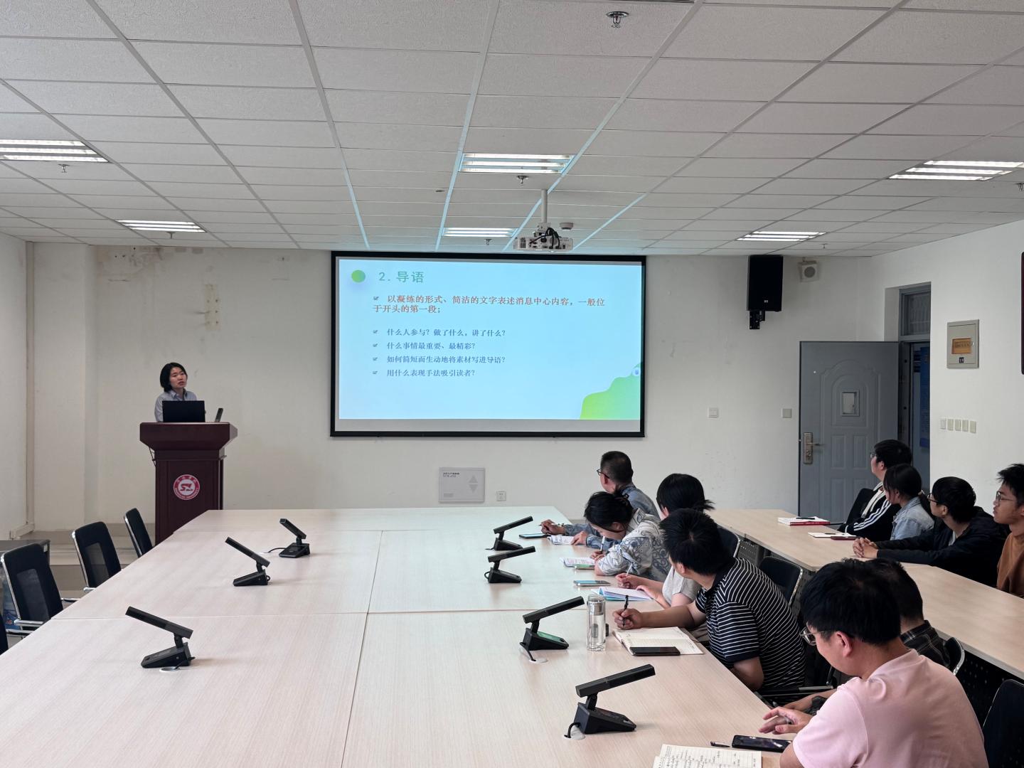 培训伊始,刘雪对新闻稿撰写的重要性和基本要求进行了详细阐述。她指出,新闻稿是传递校园动态、展示学校风采的重要载体,一篇优秀的新闻稿需要具备时效性、真实性、创新性等特点。随后,她从新闻的基本知识入手,介绍新闻的定义、要素和结构,强调“5W1H”在新闻写作中的重要性。同时,她按照校园新闻稿的常见类别,分享具体的写作思路与方法,为在场师生提供清晰的写作指引。